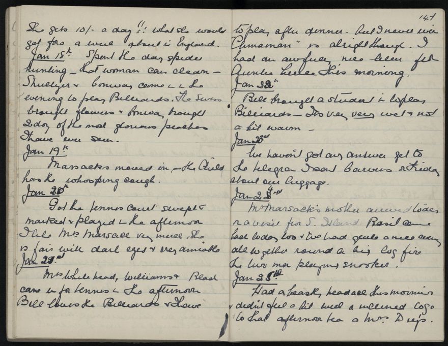Handwritten diary of Ann ('Nan') Kathleen Jacques, nee Jobson (31 December 1894 - 27 August 1994). She immigrated to New Zealand from England in 1928 with her husband William Jacques, who had been appointed to the staff of the new Massey Agricultural College.
