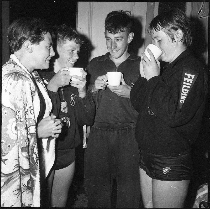 This image was taken for a story that ran in The Manawatu Evening Standard on 25 January 1961: "Junior swimmers at the Feilding Swimming Club's weekly meeting last night warmed themselves with a cup of tea. From the left are Jennifer Knowles, Francis Bell, Kerry Gracie (who will swim in the 220yds and 440yds events at the national championships at Tauranga) and Phyllis Mangham (Intermediate)."