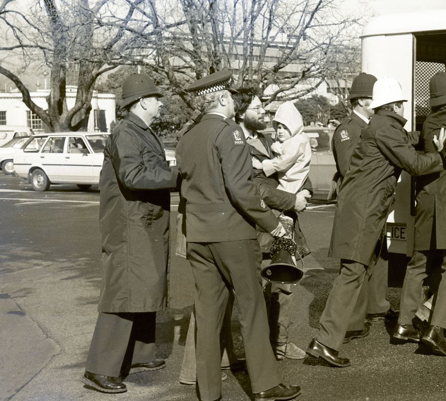 This image was taken for a story that ran in The Manawatu Evening Standard on 15 August 1981, with the caption: "Protesters arrested in city march." Seven protesters were arrested at different times during the march and three were later charged with obstruction. This march began in Amesbury Street and continued down Broadway. At the intersection of broadway and the Square, the march diverged with some following the route agreed to in the permit and others linking arms in the intersection, prompting police intervention.