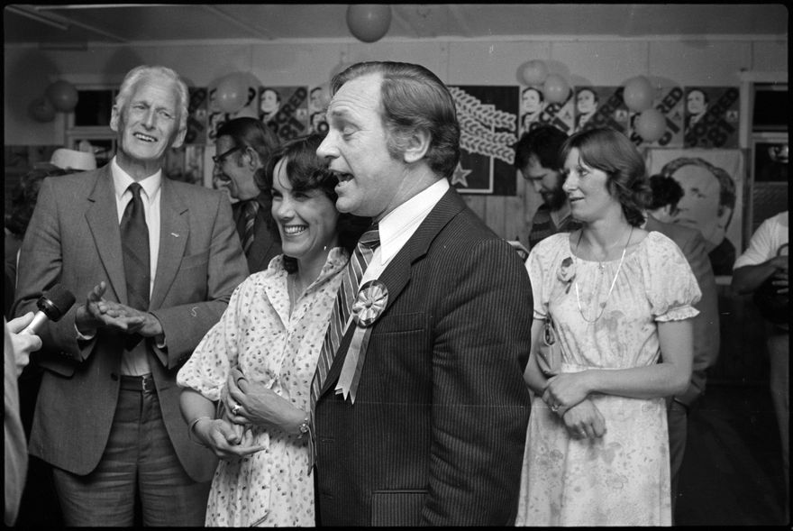 This image was taken by the Evening Standard on Saturday 28th of November 1981 but was not published. It depicts Social Credit leader Bruce Beetham celebrating his successful campaign for the Rangitikei parliamentary seat, with his wife Beverley and various supporters at the Victory Hall in Marton.