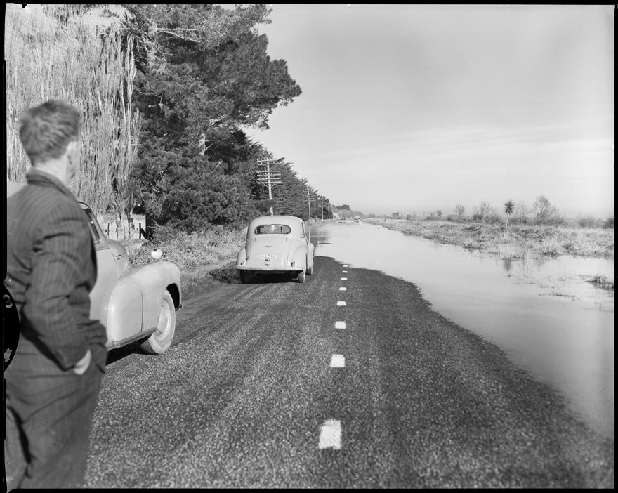 This image was taken for a story that ran in The Manawatu Evening Standard on 21 May, 1959. "About 300 acres of farmlands flooded to the north of Rangiotu included half a mile of the main Palmerston North-Himatangi road, which last evening was closed to traffic. This morning several cars were successful in their venture across. All stock has been removed to higher levels, and nearby farmers were up at all hours last night in case the flooding became really serious." Other photos associated with this article was published on the same day.