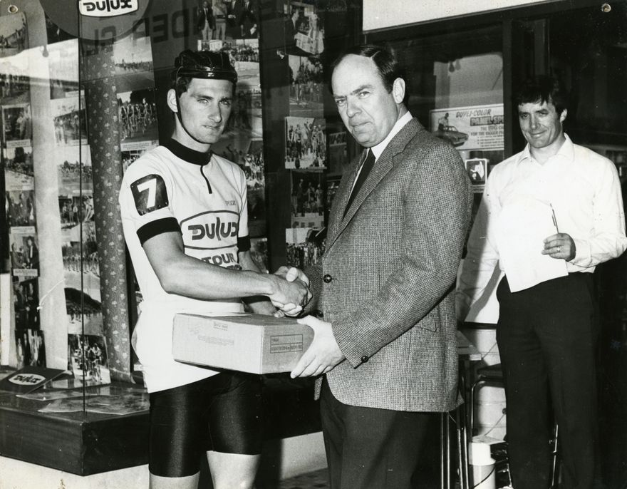 - Dulux Six-Day Cycle Race competitor Allan Peiper receives his stage prize from Palmerston North Mayor Brian Elwood outside the Dulux Paints store that once stood on Fitzherbert Avenue.