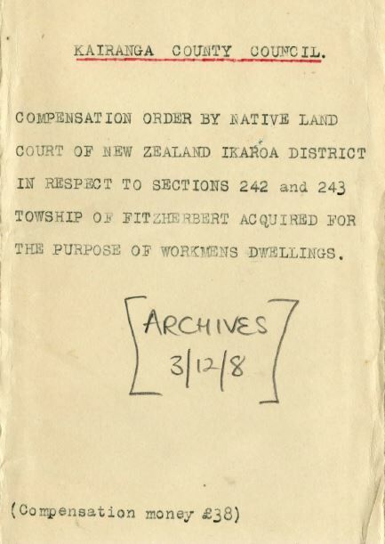 A compensation order from the Native Land Court of New Zealand, Ikaroa District, ordering the Kairanga County Council to pay compensation of £38 for land taken in the township of Fitzherbert for building Workers' Dwellings. The compensation was divided between Perenara Heremia and Ngaone Heremia, who received £19 each.