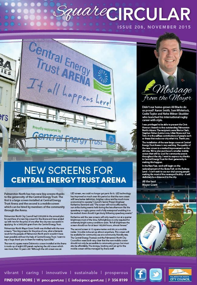 The Square Circular was Palmerston North City Council's monthly community publication, informing Palmerstonians of PNCC initiatives, activites, and events. This month's issue includes: Central Energy Trust Arena screens; Grant Smith; gardening; civil defence; civic honour awards; kapa haka competition; skate park upgrade; water conservation; Hopwood clock tower; Moxies; Esplanade scenic railway; councillor contact details; council meetings.