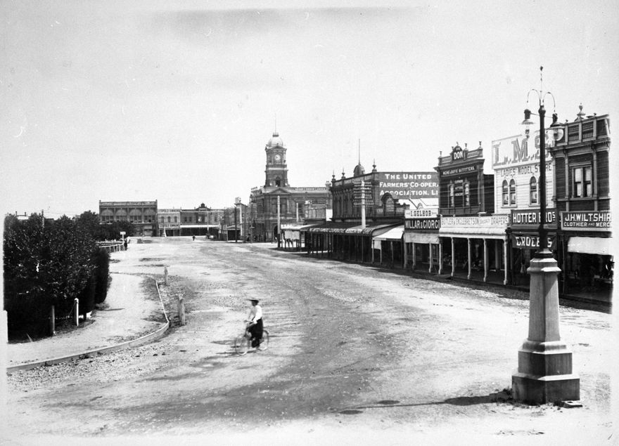 [1] JH Wiltshire, clothier and mercer; [2] Hotter Brothers, grocers; [3] Ladies' Model Store (LMS). Butter and Englebretson, Drapers; [4]"The Don", Millar and Giorgi, men's outfitters (established 1902); [5] The United Farmers Co-Operative Association (UFCA), est. 1895. [6] ?