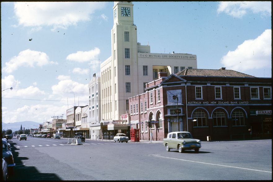 The corner of Broadway and The Square. The Australia and New Zealand Bank Limited building (now demolished) is on the corner with the prominent T& G Mutual Life building (still existent), built 1938, behind it.
