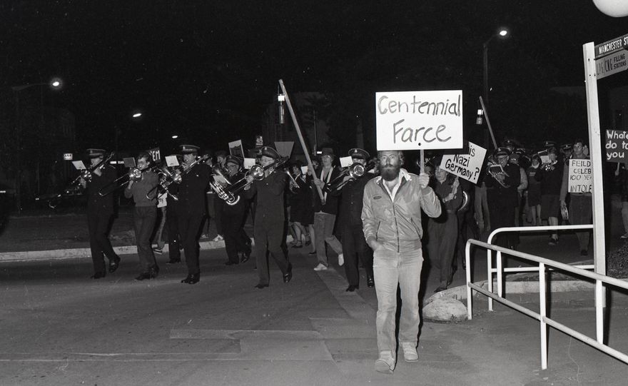 “Feilding Gay Task Force members flank the Salvation Army Centennial march through the town last night. About 15 to 20 task force members walked silently beside the march, letting their banners speak for them in their protest against the Salvation Army’s opposition to the Homosexual Law Reform Bill. Spokesman for the group Peter Pawson said the protesters were asked to stop, but the protest remained peaceful and non-violent.”