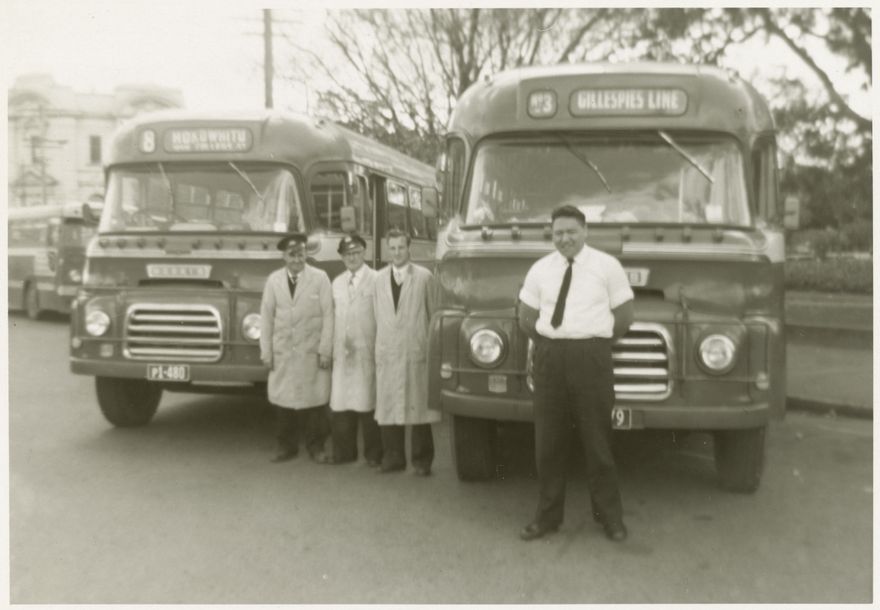 These buses are believed to be the Palmerston North No.1 and No.2 buses, both Morris 702s with Hawke B35D bodies, new in 1960. chassis numbers 86785 (No.1) and 90906 (No.2). They were photographed in The Square.