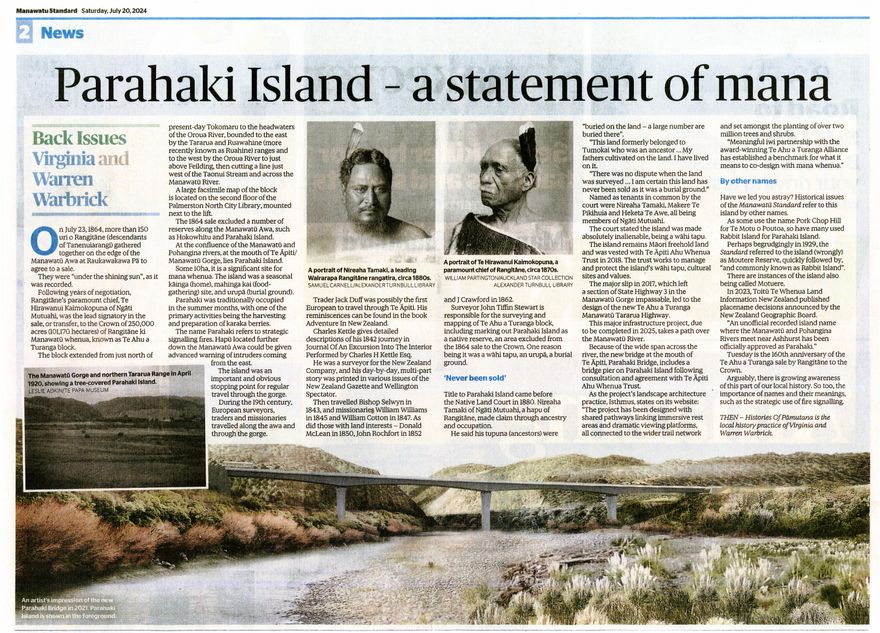 Local historians weekly "Back Issues" article in the Manawatū Standard. History of Parahaki Island. Approximately 10 hectares, it is located at the confluence of the Pohangina and Manawatū rivers. It is a significant site for mana whenua. It was historically used as a seasonal kāinga (dwelling), mahinga kai (food-gathering place) and urupā (burial ground/graveyard).
