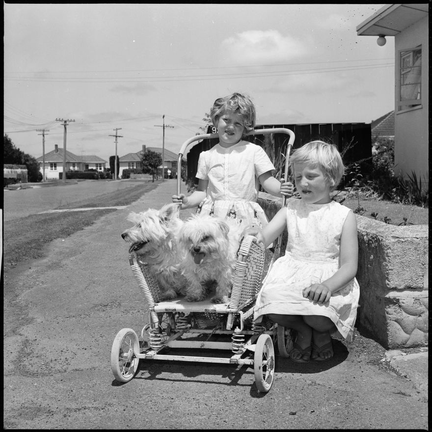 This image was taken for a story that ran in The Manawatu Evening Standard on 31st December 1965 "Lynda Thompson (three) and Kathryn Thompson (five), of Vogel Street get more pleasure from playing with their neighbour's two dogs that they do from their dolls, said their father this morning. And the dogs? Well, they just love all the attention they receive."