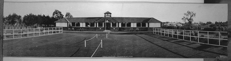 This photograph shows the main building of Palmerston North Girls' High School in 1920 after vacating the old Boys' High School building in 1919. The tower in the centre of the photograph was removed in the 1930s and the rest of the building remained unchanged until around 1977 when it was demolished. THe new building on this site was opened in 1980.