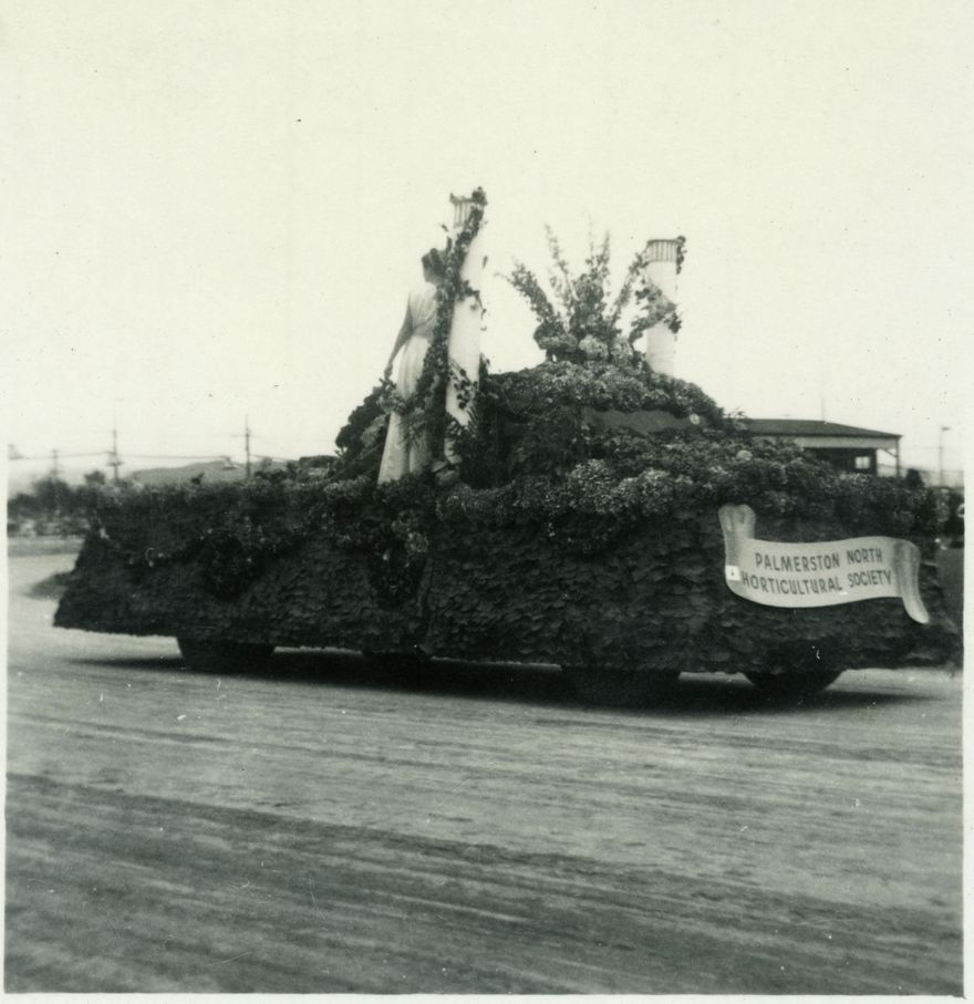 Palmerston North held its 75th Jubilee Celebrations during the week of 15th March 1952. Shown here is float decorated by the Palmerston North Horticultural society.