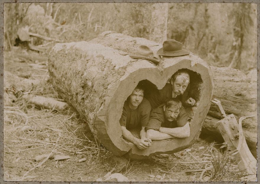 Three men posing inside a hollowed out section of a tree trunk. They are probably bush fellers.