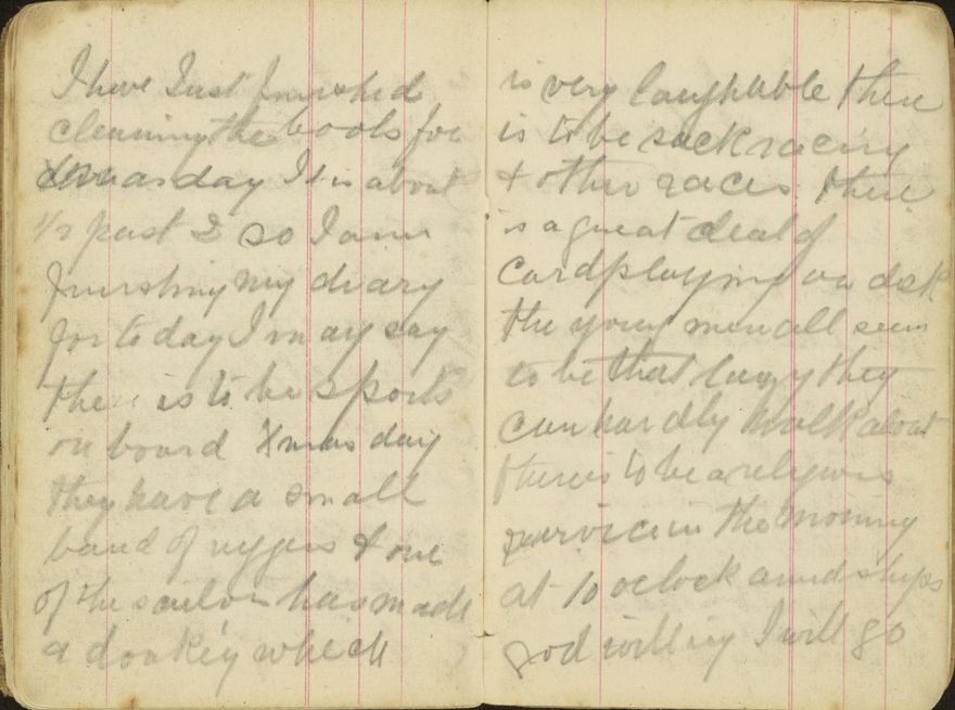 Diary written by third class steerage passenger on the 'Ionic', sailing from Gravesend and Plymouth in England to Wellington and Port Chalmers in New Zealand. The writer departed from Plymouth on 6 December 1884, with his wife and children (Esther, baby and others). The writer is unidentified but there is the name 'Mr Cole' written on the inside back cover and according to shipping records a Mr Cole and family departed on the 'Ionic' on this date. The diary begins with a list of provisions, followed by daily entries about shipboard life. The diary finishes on New Years' Day 1885 before it reaches New Zealand. The 'Ionic' reached Wellington on 20 January 1885 before proceeding to Port Chalmers. Transcription also available on Manawatu Heritage.