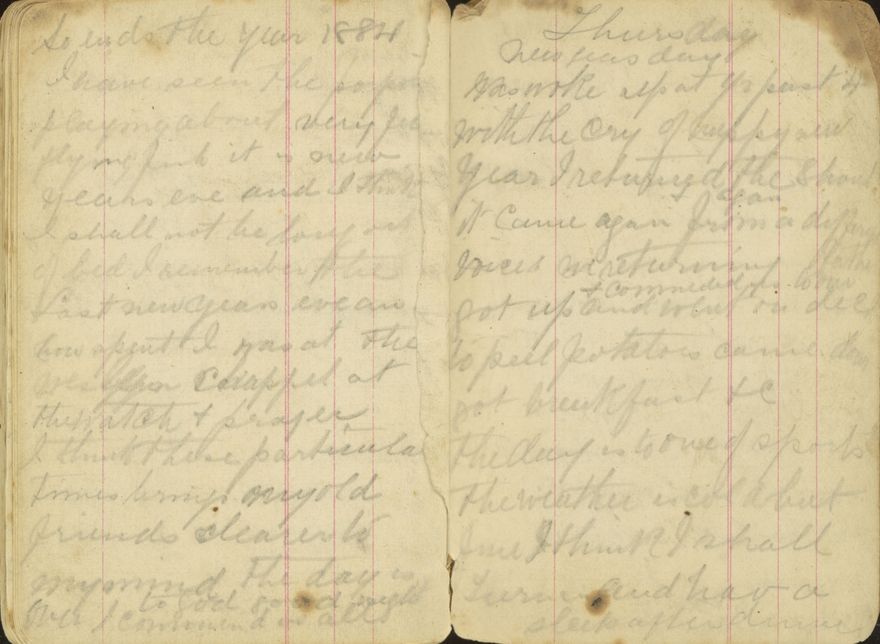 Diary written by third class steerage passenger on the 'Ionic', sailing from Gravesend and Plymouth in England to Wellington and Port Chalmers in New Zealand. The writer departed from Plymouth on 6 December 1884, with his wife and children (Esther, baby and others). The writer is unidentified but there is the name 'Mr Cole' written on the inside back cover and according to shipping records a Mr Cole and family departed on the 'Ionic' on this date. The diary begins with a list of provisions, followed by daily entries about shipboard life. The diary finishes on New Years' Day 1885 before it reaches New Zealand. The 'Ionic' reached Wellington on 20 January 1885 before proceeding to Port Chalmers. Transcription also available on Manawatu Heritage.