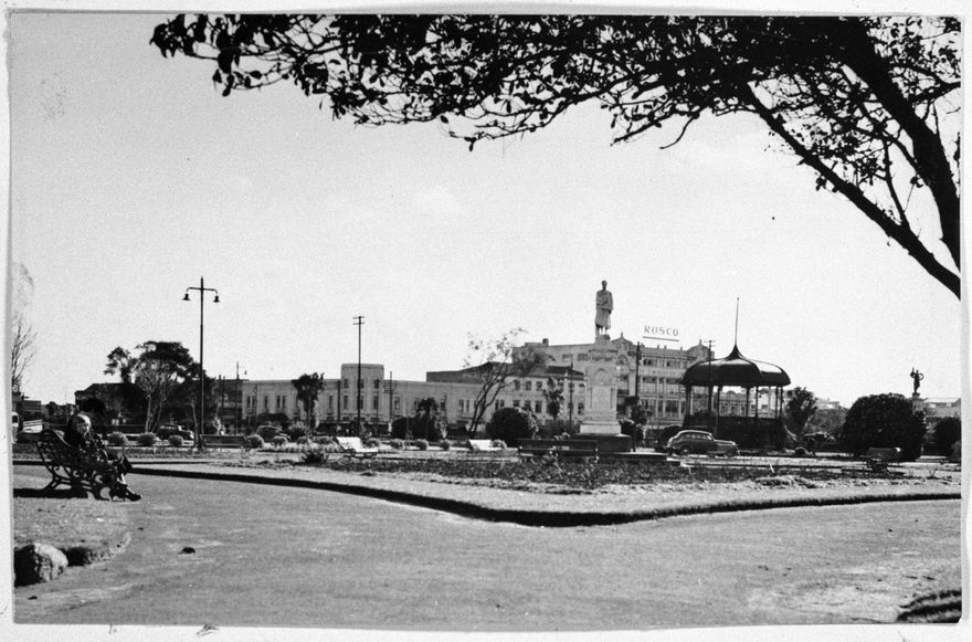 This photograph looks across The Square towards Coleman Place. The Statue of Te Awe Awe (erected 1907) is in the centre with the Band Rotunda (1907-1956) beside it. On the far left is Main Street West with the Commercial Hotel (built 1935).
