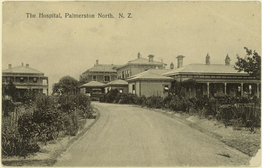 Palmerston North Hospital was opened in 1893. This image shows the original hospital, with the addition of the new men’s ward and operating theatre, added in 1903. Another two-storied building, providing an additional women’s ward - the Alexandra Ward - and nurse’s accommodation was opened 25 September 1907