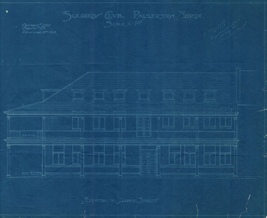 Elevation to Cuba Street plan of the Soldiers' Club Building, dated 1916. Built on the corner of Cuba and George Streets for the Manawatu Patriotic Society and completed in 1917 to a design from the firm of L G West & Son. The building was used by the Returned and Services Association until 1966 when it was sold to a private owner. Currently it houses Cafe Cuba on the ground floor whose outdoor tables can be seen occupying the footpath along Cuba Street. The building is well preserved and contains many of the original design features including cast iron columns along the verandah.