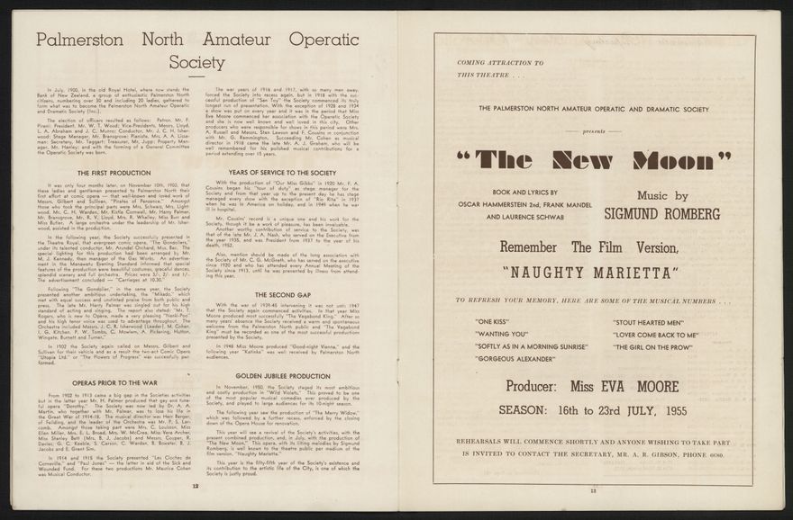 The cover of this booklet reads, "Sir J.M. Barrie's Immortal Peter Pan being the joint presentation by the Palmerston North Operatic Society (Inc.), the Manawatu Repertory Society (Inc.) [and] the Palmerston North Little Theatre Society (Inc.) in conjunction with the Palmerston North City Council on the occasion of the re-opening of the Opera House. Formal opening: Saturday, 19th March 1955. Season: 19th to 26th March, 1955 (inclusive)."