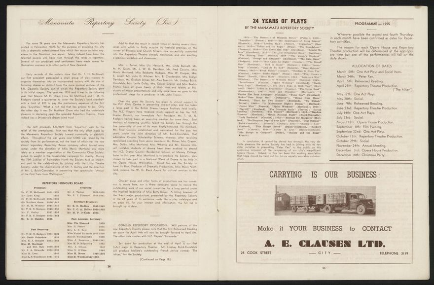 The cover of this booklet reads, "Sir J.M. Barrie's Immortal Peter Pan being the joint presentation by the Palmerston North Operatic Society (Inc.), the Manawatu Repertory Society (Inc.) [and] the Palmerston North Little Theatre Society (Inc.) in conjunction with the Palmerston North City Council on the occasion of the re-opening of the Opera House. Formal opening: Saturday, 19th March 1955. Season: 19th to 26th March, 1955 (inclusive)."