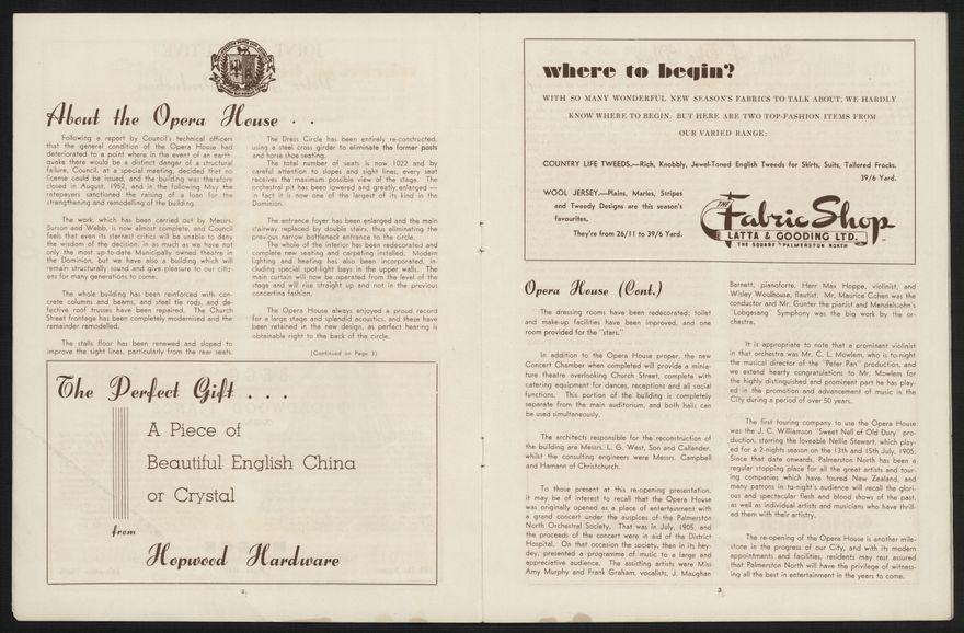 The cover of this booklet reads, "Sir J.M. Barrie's Immortal Peter Pan being the joint presentation by the Palmerston North Operatic Society (Inc.), the Manawatu Repertory Society (Inc.) [and] the Palmerston North Little Theatre Society (Inc.) in conjunction with the Palmerston North City Council on the occasion of the re-opening of the Opera House. Formal opening: Saturday, 19th March 1955. Season: 19th to 26th March, 1955 (inclusive)."