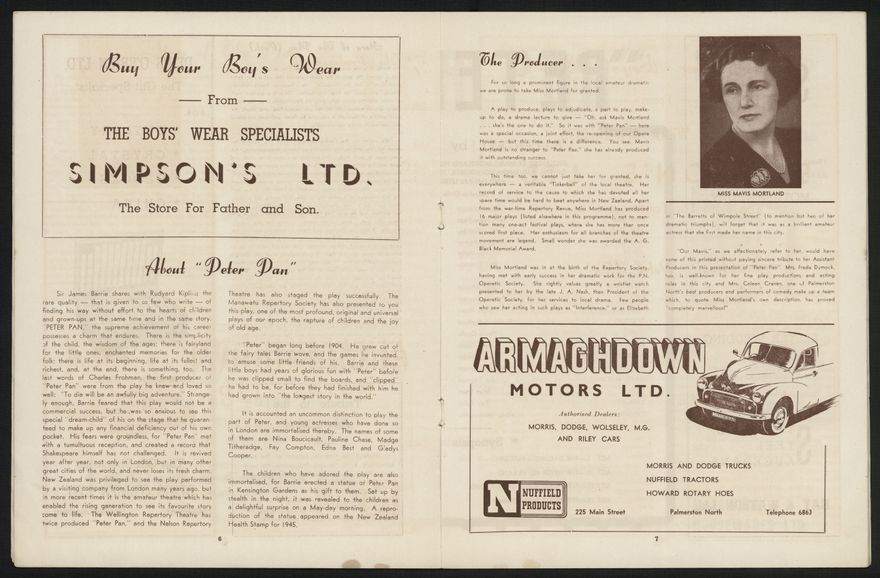 The cover of this booklet reads, "Sir J.M. Barrie's Immortal Peter Pan being the joint presentation by the Palmerston North Operatic Society (Inc.), the Manawatu Repertory Society (Inc.) [and] the Palmerston North Little Theatre Society (Inc.) in conjunction with the Palmerston North City Council on the occasion of the re-opening of the Opera House. Formal opening: Saturday, 19th March 1955. Season: 19th to 26th March, 1955 (inclusive)."