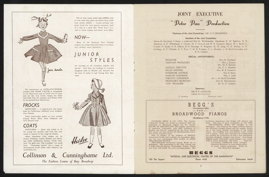 The cover of this booklet reads, "Sir J.M. Barrie's Immortal Peter Pan being the joint presentation by the Palmerston North Operatic Society (Inc.), the Manawatu Repertory Society (Inc.) [and] the Palmerston North Little Theatre Society (Inc.) in conjunction with the Palmerston North City Council on the occasion of the re-opening of the Opera House. Formal opening: Saturday, 19th March 1955. Season: 19th to 26th March, 1955 (inclusive)."