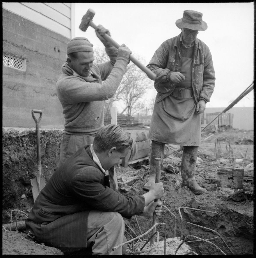 This image was taken for a story that ran in The Manawatu Evening Standard on 09 June 1961 "Many young women making use of the extensions to the Y.W.C.A. Activity Block will have the work of one man to thank - Sir Bruce Levy. Sir Bruce, doing most of the preparatory work, can be seen six days a week on the site preparing for the weekend when eight to 10 men assist him. All this work is done voluntarily. Due to the building site being on a swampy area, the piles have had to be driven 15 ft. "This has been our first major difficulty to date, and the first time outside contractors have been called in," commented Sir Bruce today. Sir Bruce in working clothes appropriate to the conditions, is seen watching men knocking the top from a driven pile to bring it into the right level for the foundations. When completed the activity block will cover an area of 3200 square feet, containing basement playroom, extensions to the existing activity block and stage, with an activity room behind this."