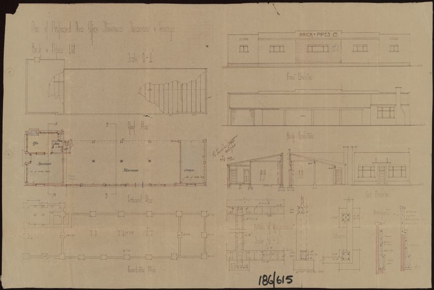 This plan is for the commercial premises of Brick & Pipes Ltd in Featherston Street. The brick building featured an office and storeroom near the street, with a storeroom and garage behind. Today only a portion of the front part of the original building remains. This is owned and maintained by the Hoffman Kiln Trust.