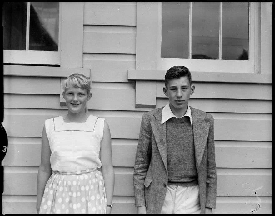 [Photograph of Duxes of City and District Schools: C. Rowland and V. Hansen standing outside their school (unknown)."