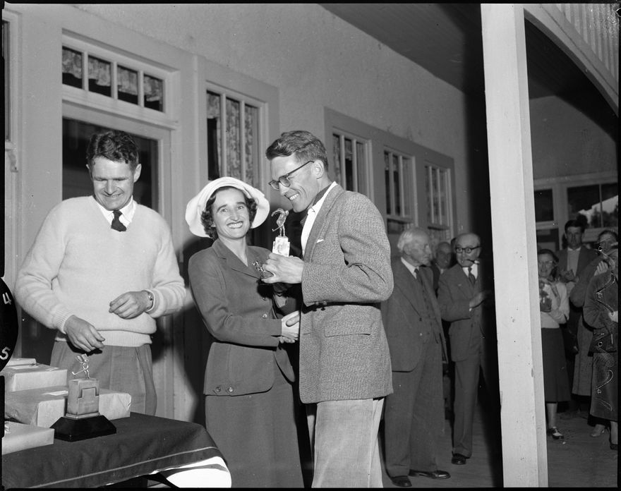 This image was taken for a story that ran in The Manawatu Evening Standard on 23 September 1958: "Mrs. L.B. Ogilvie presenting the Devil's Own Cup to J.F. Goldfinch at the conclusion of the legal golf tournament yesterday at the Manawatu golf links. Goldfinch narrowly beat last year's winner of the trophy, G.T. Rapley."