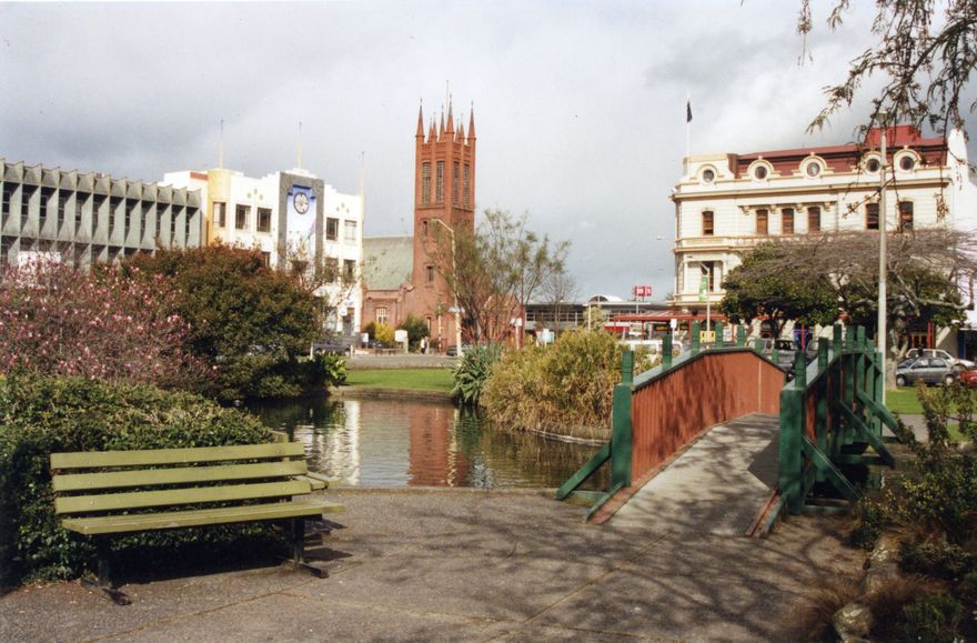 From the left of the picture, in the background can be seen the Manawatū Standard building, Square Edge, All Saints' Church and the NZ Post office, around to the Grand Hotel on the right hand side.