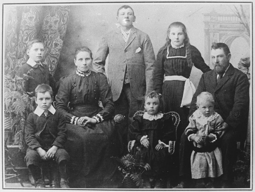 Anders and Annie Petersen were migrants from Denmark. They first lived in Pahiatua, before settling in Aokautere on a 37 acre farm where they kept 15 cows. The couple had five sons and three daughters. This image is derived from a copy negative, which has partially cropped the original photograph. The family are, from left: Jens, Thorval, Annie, Chris, Dagmar (front), Mary, Johanus (front) and Anders. The eldest daughter Kate has been cropped from the right side of the image, with only her elbow visible.