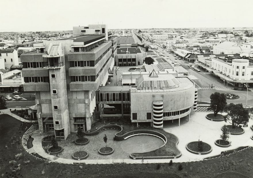 The recently completed Palmerston North City Council building, built to straddle the road around The Square so that it encroached on The Square. The photograph looks down Main Street on the right.