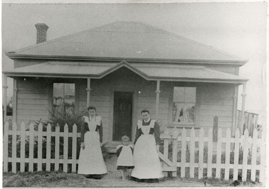 Ann Maria Spry (nee Woolford) with her eldest daughter Alice and youngest daughter Edith in front of their house on Medway Street in Rongotea. Ann Maria was married to Thomas Spry - a blacksmith, who died 29 September 1901 at 45 years of age. Her parents were Charles and Sarah Woolford were early settlers in the Bulls/Rangitikei region. Ann Maria and Thomas had 8 children and they are both buried in Rongotea. Edith married John Holland and they had 4 children and they both are buried in Palmerston North. Alice Spry married Fred Burgess. They had five children - Evelyn, Annie, George, Russell and Sydney.