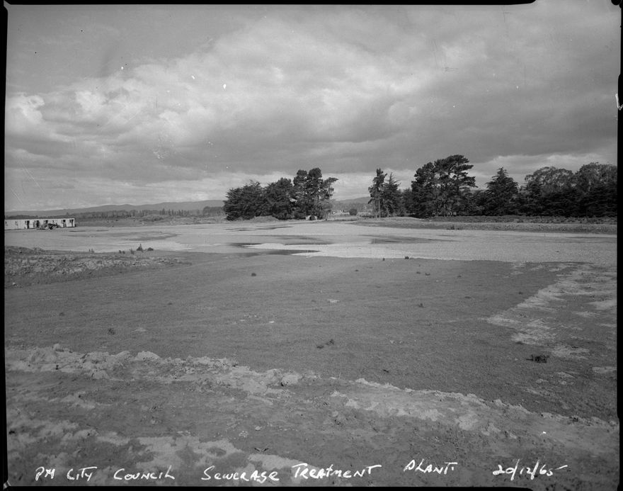 The sewerage treatment plant beside the Manawatu River opened in 1968, replacing the septic tank and filter beds which had been in use since 1905. Some images from this collection have been digitised from prints housed in other archival collections. This image is from an original negative.