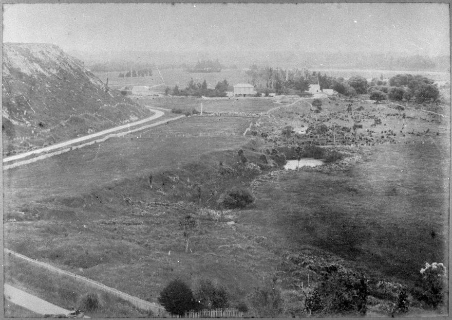 This view is taken from Anzac park, looking along the river flats. Batchelar’s ‘Willowbank’ homestead, constructed in 1880 – 1881, can be seen in the middle distance. The buildings and land were purchased by the Government in 1926 and provided the first offices, teaching rooms and farmland of Massey Agricultural College when it opened in 1928. After the College moved to a site on the hill across the road the house was used as a student hostel. The building remained in use by the University until it was demolished in the 1980s.