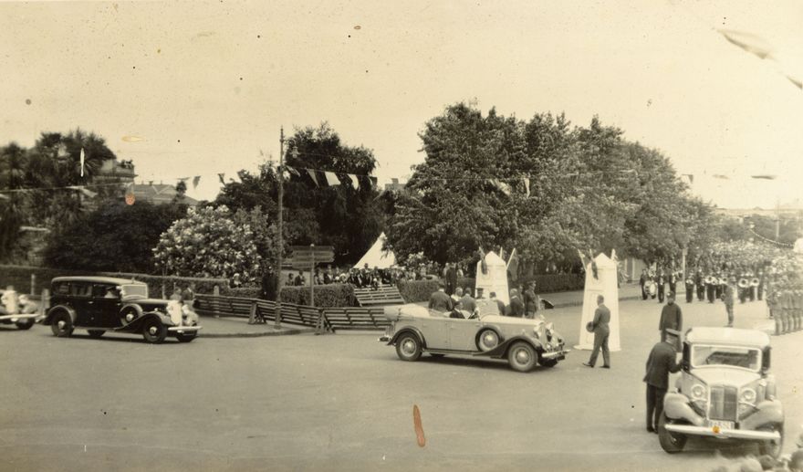 The Duke leaves his open topped car in The Square to view the welcoming band. Prince Henry, Duke of Gloucester, was the third son of George V and Queen Mary, and visited New Zealand 15 December 1934 - 29 January 1935.