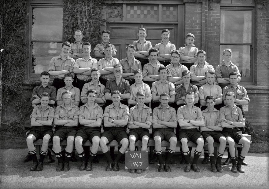 The boys from Form Va (i) in 1947 pose for their photograph. According to the school year book for 1947, the boys in this form are: D Beck, M Bockett, F Brown, T Carr, G Croker, C Currie, L Drager, G Fraser, J Forsythe, M Hay, P Heise, W Jeromson, G Kirkland, R Learmonth, L Legg, O Lewis, D Liddell, I Lonie, M Loudon, K Manhire, D McKenzie, W Mills, W Morrison, B Murdoch, B Ogier, P Palmer, J Parker, N Ross, P Sayers, W Smith, I Stephenson, H Stevenson, B Turner, W Turner, J Wesney and B Wilson. As only 31 boys are present in this picture, presumably some were absent on picture day.