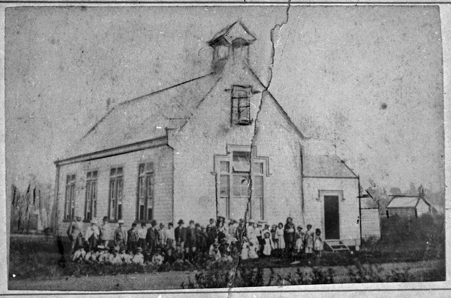 This photograph is the earliest known photo of Palmerston North's first public school. The photo was taken after 1878 because the first Presbyterian Church (erected in that year) can be seen in the background on the far right. This school was the fore-runner of the present Central School and was established in the year 1872 with Mr R N Keeling as teacher. When a new school was erected in 1890, this building was probably incorporated into the first Empire Hotel, which was destroyed by fire in 1895. There were four main incarnations of Central School - The Original School (corner of Main and Princess Streets, 1872-1890), Campbell Street School (1890-1922), Central School (Featherston Street, built 1922), Central Normal School (became a practice school for teachers college students in 1956). The school has been partially drawn in by hand.