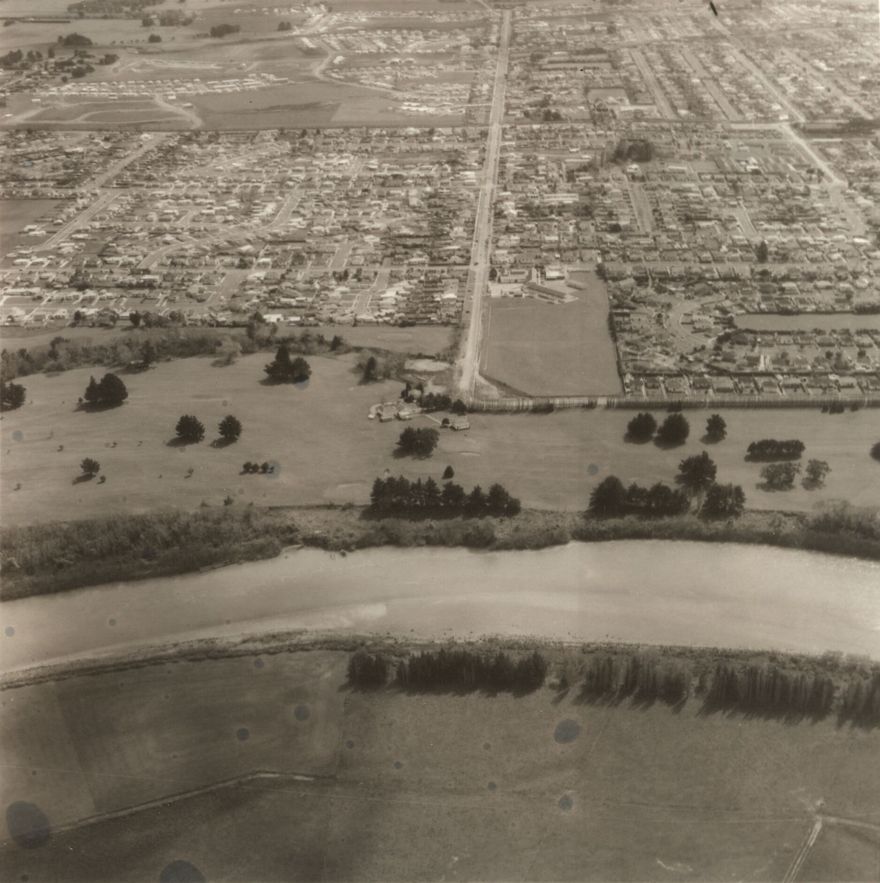 Fifth photograph, in a series of aerial shots, showing what was to become the Awapuni suburb. Botanical Road runs through the centre of the photograph to the Palmerston North Golf Club Golf . The Manawatu River can be seen in the foreground. In 1964 the Palmerston North City Council acquired the Golf Club for residential development and the Club relocated to the end of Brightwater Terrace. See also 2008P_OSP_STR_2049 / 2050/ 2051/ 2028/ 2053