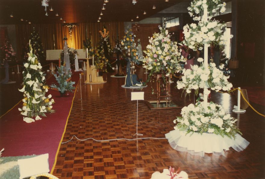 The "Royal Wedding" floral art display seen here was held at the Palmerston North Convention Centre in July 1981 to commemorate the wedding of Prince Charles to Lady Diana Spencer. The display was mounted by the Manawatu Area Floral Art Society under the title "Royal Occasion".