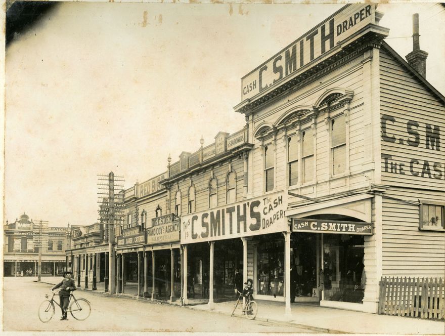 This postcard shows a view of the intersection between Main Street and Broadway Avenue, in The Square, Palmerston North. Visible are: C. Smith Draper; Dresden Piano Company; E Gascoigne: Grocer, Baker, Caterer; Barry Ironmonger; F.C. Hatch Porter; Red Bird Cycle Engineers.
