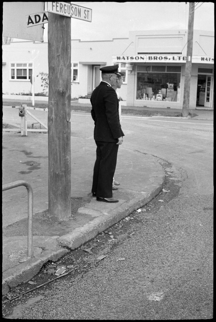 “Senior Traffic Officer Willis examines an intersection with Mr. J. Jenkins for sign posting and road markings.”