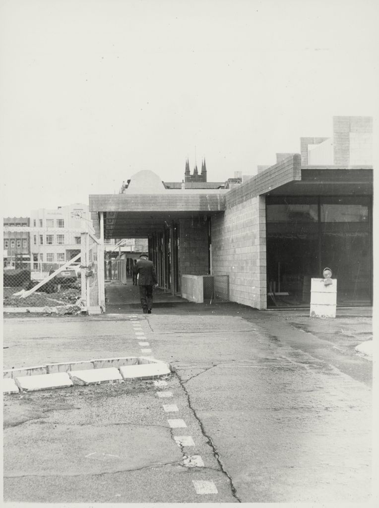 The building of the new Palmerston North City Council administration offices on The Square. This shows construction on the corner of Main Street.