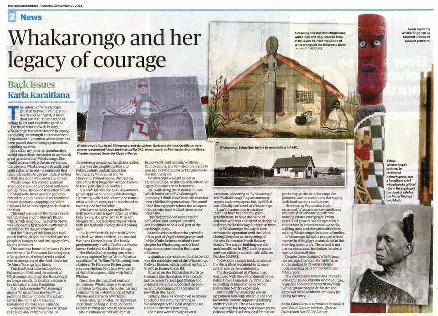 Local historians weekly "Back Issues" article in the Manawatū Standard. Whakarongo settlement carries the name of a nineteenth century Rangitanē woman of courage and resilence. Whakarongo was raised as a whāngai at Te Kuripaka pa by her uncle, Te Aokautere, a prominant Rangitāne leader. She was taken to Kaipara during a conflict where she lived until her brother took her back to the Manawatū in her later years. Whakarongo settlement, just north of Palmerston North, was so named to honour this Rangitāne wahine.