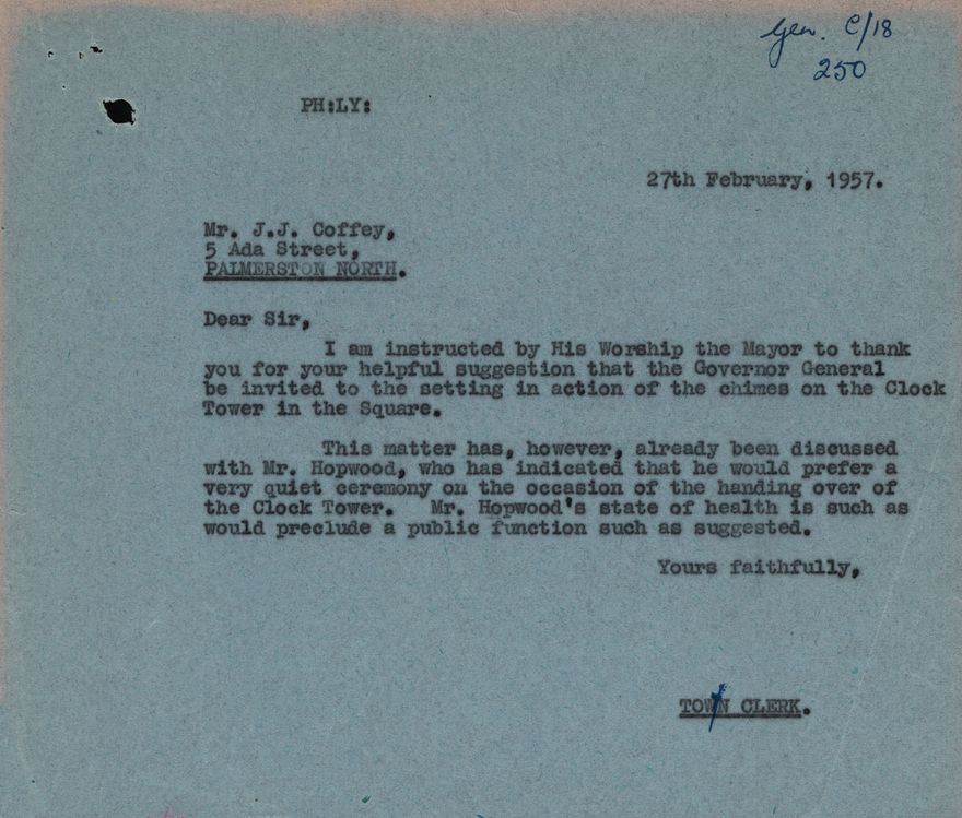 In 1953 Arthur Hopwood gifted the city of Palmerston North £10,000 to build a tower in The Square to hold the clock and chimes removed from the Post Office after the 1942 earthquake. It was opened in 1957. In reply to Mr J J Coffey, 5 Ada Street, Palmerston North, suggestion that the Governor General be invited to open the new structure the Council thanked him but said would be a quiet ceremony due to the health of Arthur Hopwood.