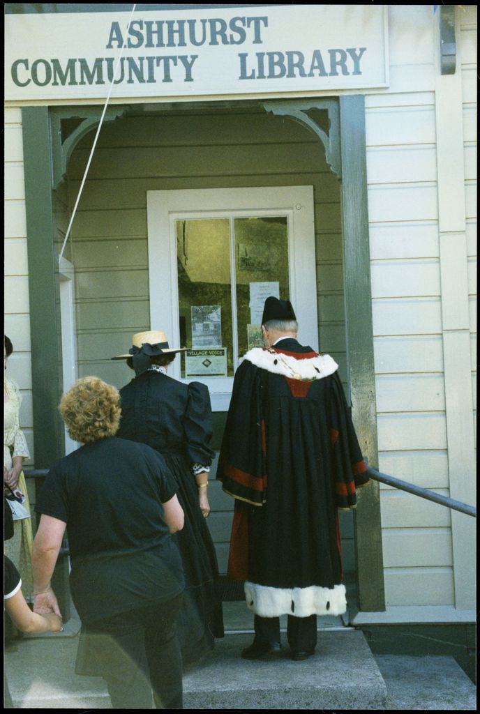 On the occasion of the Ashhurst (former) Post Office building's centenary. The building is now used at the town library. In this photograph the Mayor of Palmerston North, paul Rieger, and the Ashhurst Librarian, Mary Rae Bowling walk into the library.