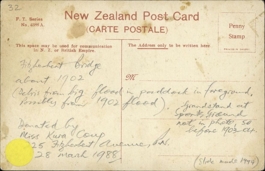 Looking across the Fitzherbert Bridge from what is now Anzac Park. To the immediate left, across the bridge, is the Victoria Esplanade.