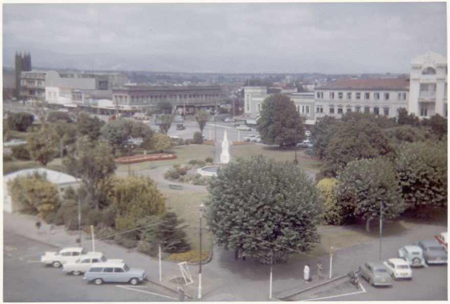 This colour print shows a view of The Square. Notable features include The Coronation Fountain (white monument in the middle), All Saints Church (brick structure with spires in the left background) and what was then the Milne and Choyce Department Store (far right background, formerly Roscos and DIC, currently the City Library).